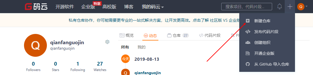 首先打开码云官网,登录自己的账号, 点击右上角的新建仓库