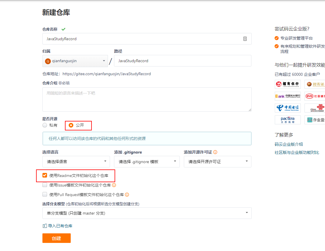 仓库名称最好是与你当前学习内容相关的名字,比如在学 JAVA ,这里直接就写 JavaStudyRecord ,下图中红框内容一定要记得勾选: