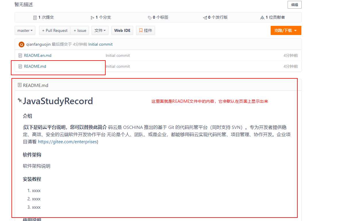 README 文件是仓库中的一个特殊文件,当你点击进仓库时,仓库中的 README 文件中内容会自动显示在页面上,具体介绍看下图: