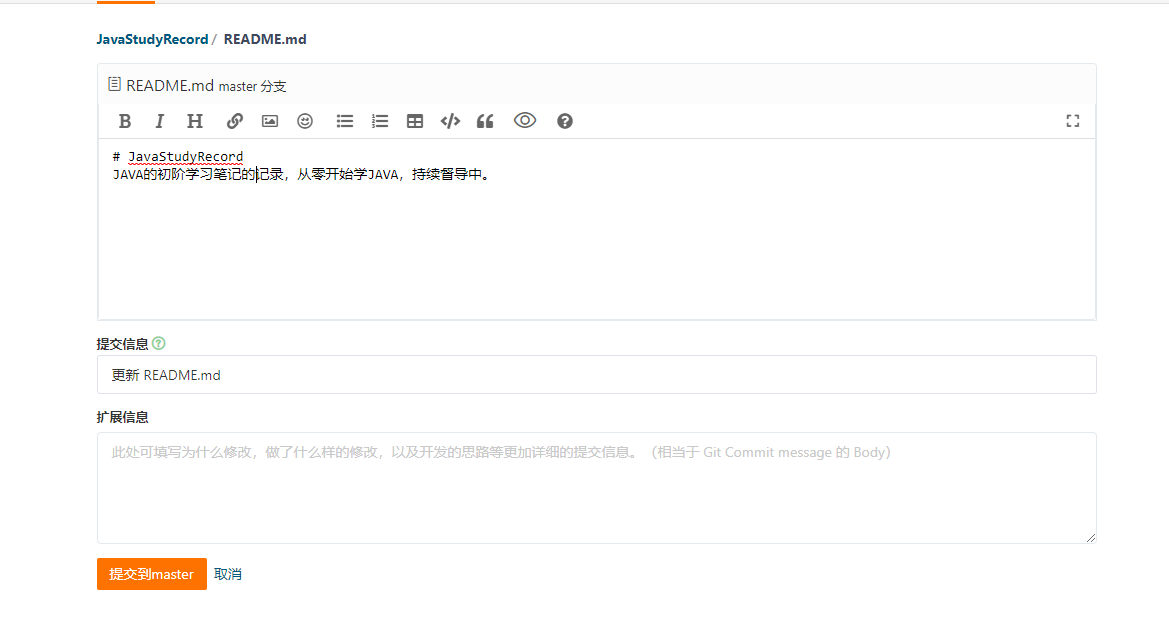 编写完成后,点击图中最下方的提交到 master,此时会跳转到 README 文件内容页,效果如下图