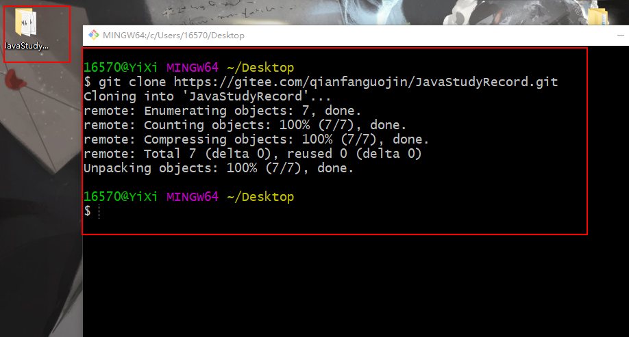 如下图所示,执行成功后,桌面会创建一个与码云上仓库同名的文件夹: