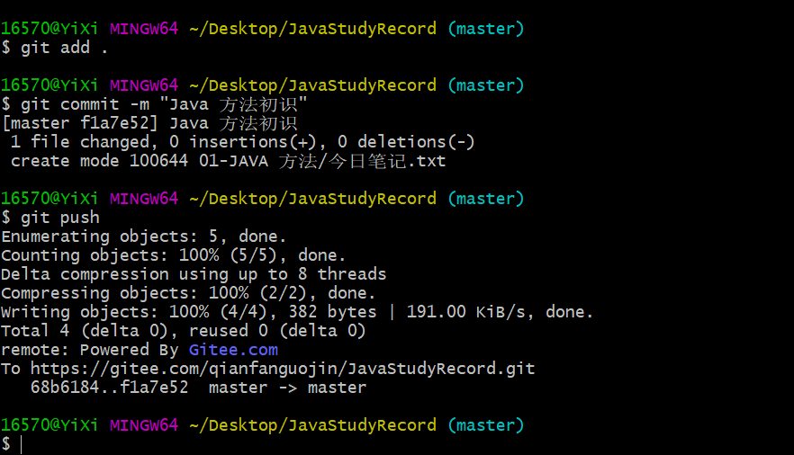 这个命令会将我们已修改的文件,也就是我们刚刚新建的01-Java 方法文件夹内容,都添加到暂存区,记得后面有个小数点。