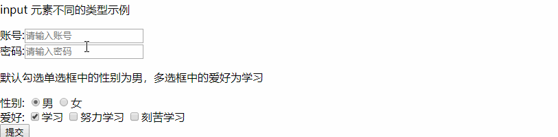 <p>默认勾选单选框中的性别为男,多选框中的爱好为学习</p>