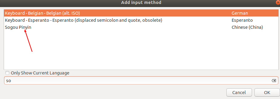 点击左下角 + 添加输入法,搜索搜狗输入法(因为是英文所以搜索Sogou),选择然后点击 ok