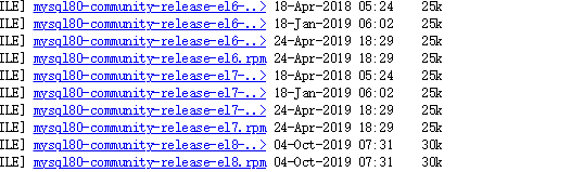 其中前面的 mysql57 、 mysql80 分别代表 mysql5.7 版本和 8.0 版本,后面的 el5、el6、el7….. 分别代表 Centos 的系统版本,安装之前,请按自己的系统版本选择对应的 rpm 源文件。