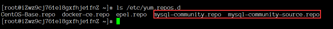安装完成之后,会在 /etc/yum.repos.d/ 目录下新增 mysql-community.repo 、mysql-community-source.repo 两个 yum 源文件。
