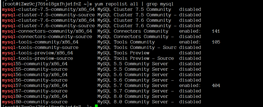 mysql57-community为 enabled(启用) ,这代表默认安装则为mysql5.7 版本,而有时候我们可能需要更新或者说需要安装更高版本的mysql,此时我们就需要更改默认的安装包。修改成mysql8.0: